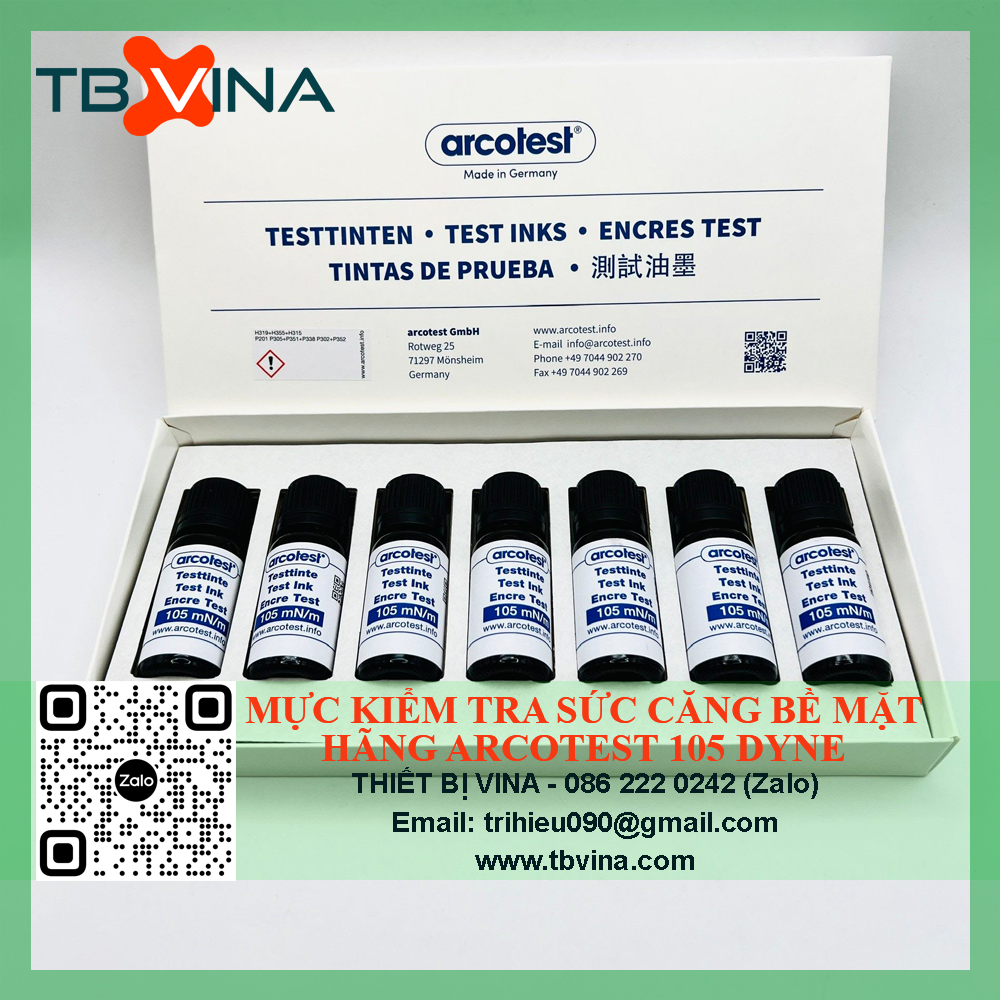 Mực kiểm tra sức căng bề mặt 105 DYNE thường được sử dụng để kiểm tra năng lượng bề mặt của các sản phẩm như: Nhựa, kim loại, màng PE, màng PP…